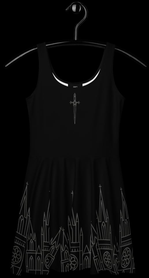 The Sanctum Dress carries a dagger at the heart and a cathedral hem rising in gothic arches. Every detail is etched in shadow-grey, turning the silhouette into a ritual garment worthy of midnight rites.